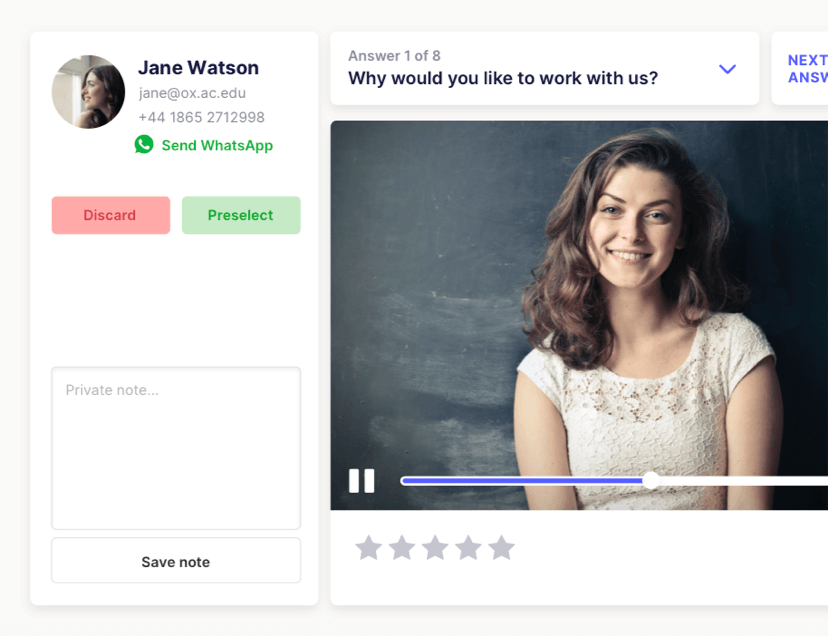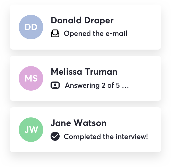 No need to schedule interviews or phone calls with the entire candidate pool, or coordinate time zones. Candidates can view each interview question from the hiring manager and record their answers at their own time.